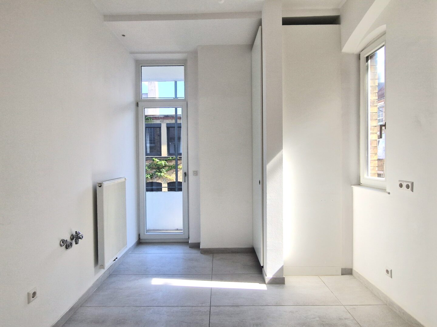 Die Küche ist nicht möbliert und kann ganz nach Ihren Vorstellungen eingerichtet werden. Von hier aus gelangen Sie direkt auf den Balkon, der zu entspannten Momenten im Freien einlädt.