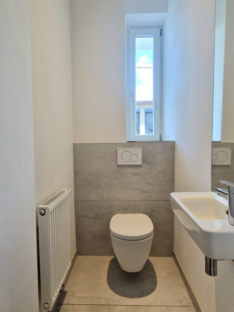 Das helle Tageslichtbad ist mit Dusche, zwei Waschbecken und WC ausgestattet. Ein separates Gäste-WC sorgt für zusätzlichen Komfort – besonders praktisch für Familien oder Besuch.