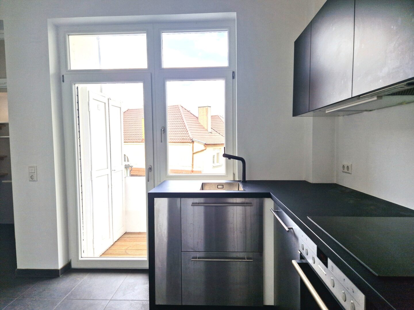 Die moderne Einbauküche überzeugt durch ihre hochwertige Ausstattung und einen praktischen Abstellraum. Von hier aus gelangen Sie direkt auf den sonnigen Balkon – perfekt für ein Frühstück im Freien oder einen entspannten Ausklang des Tages.