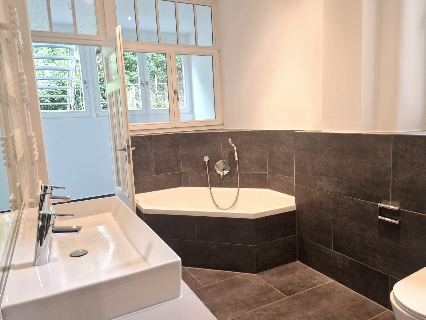 Das moderne Tageslichtbad bietet höchsten Komfort: Mit Regendusche, Badewanne, Doppelwaschtisch und WC ist es über den Flur sowie vom Wintergarten aus zugänglich. Ein separates Gäste-WC ergänzt die Ausstattung.