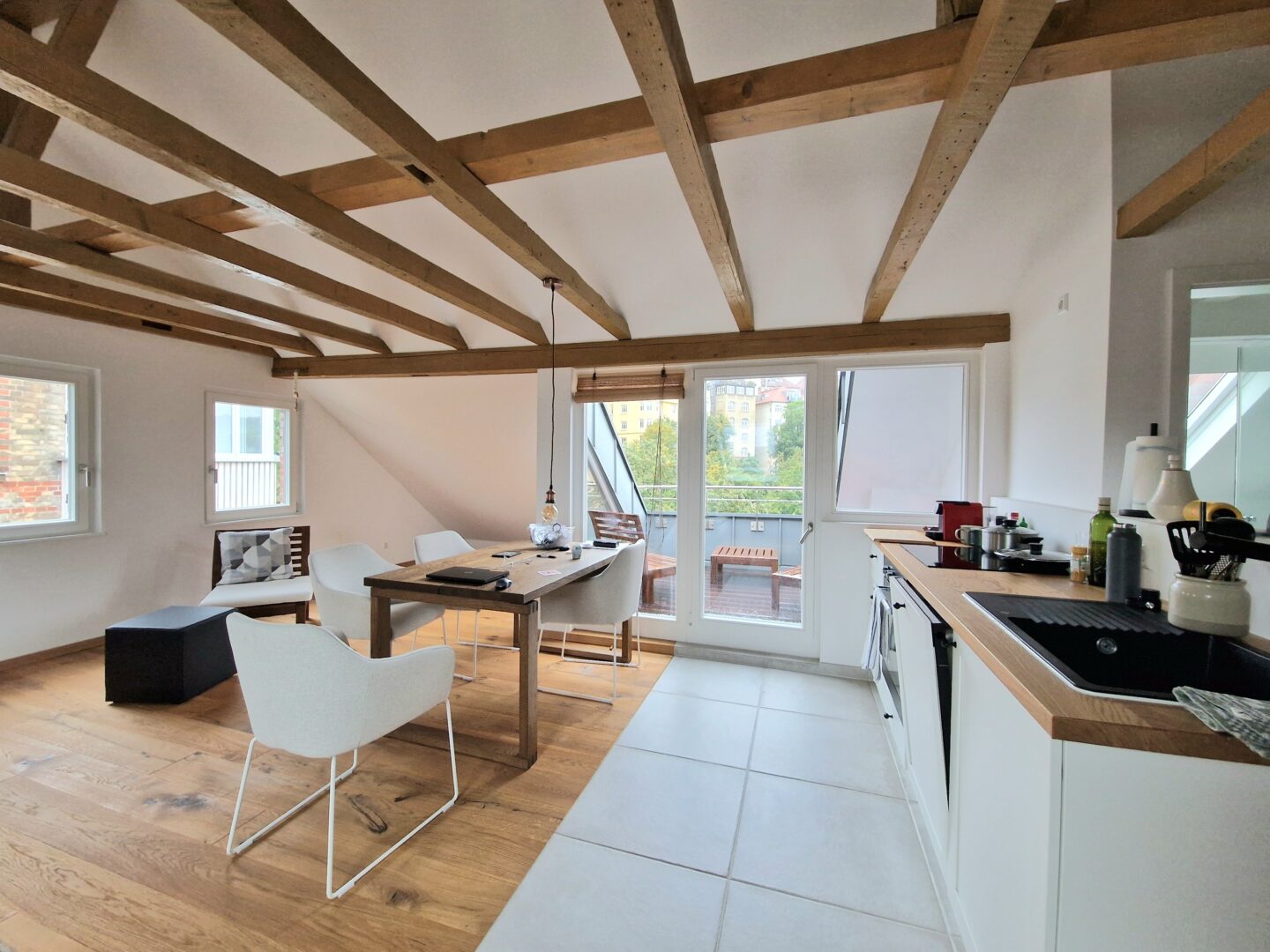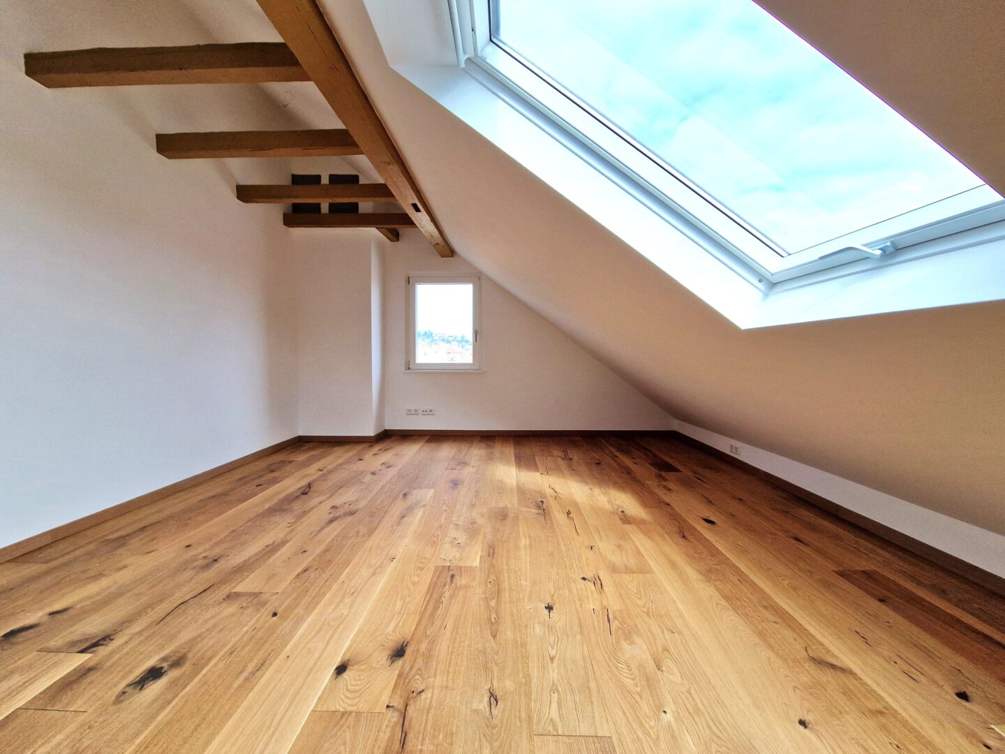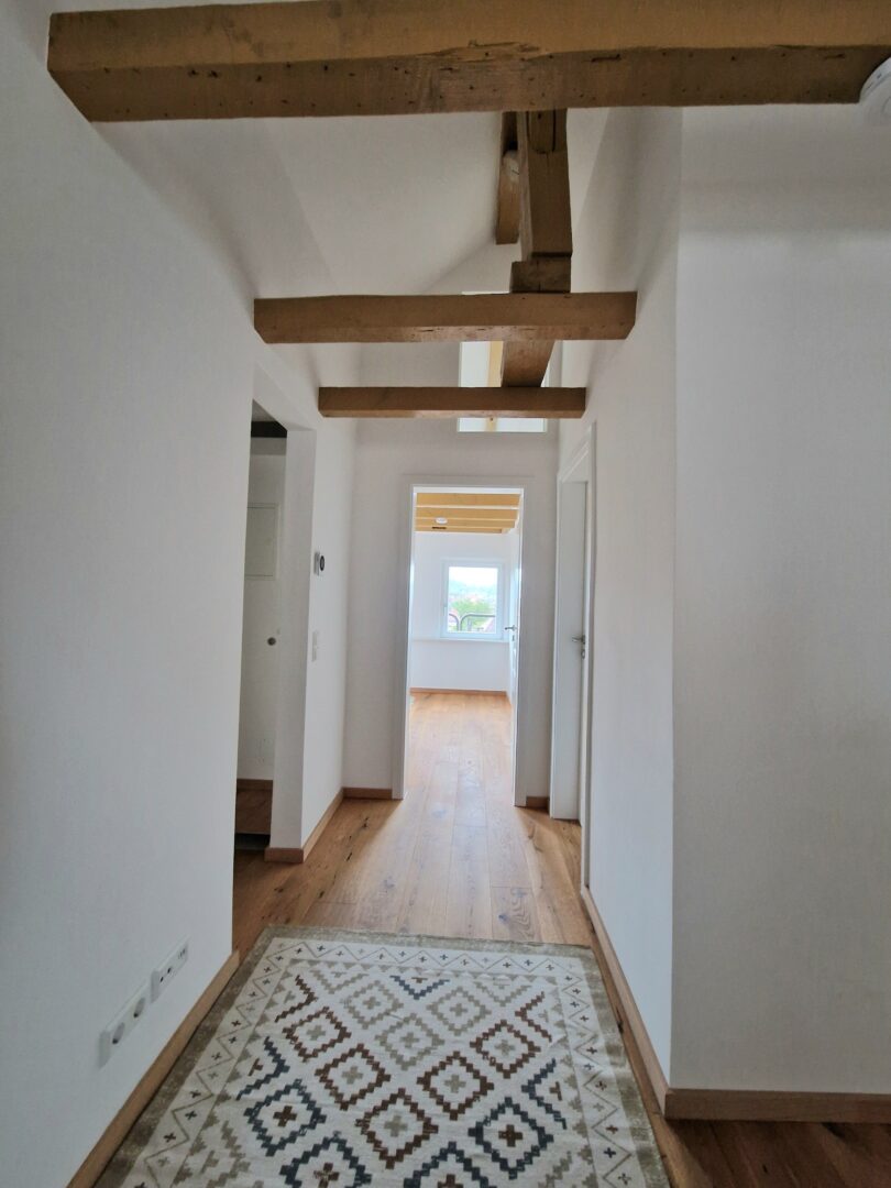Ein besonderes Highlight sind die sichtbaren Holzbalken, die dem Interieur einen unverwechselbaren Charakter verleihen und den Charme des Altbaus perfekt mit zeitgemäßem Wohnkomfort vereinen.