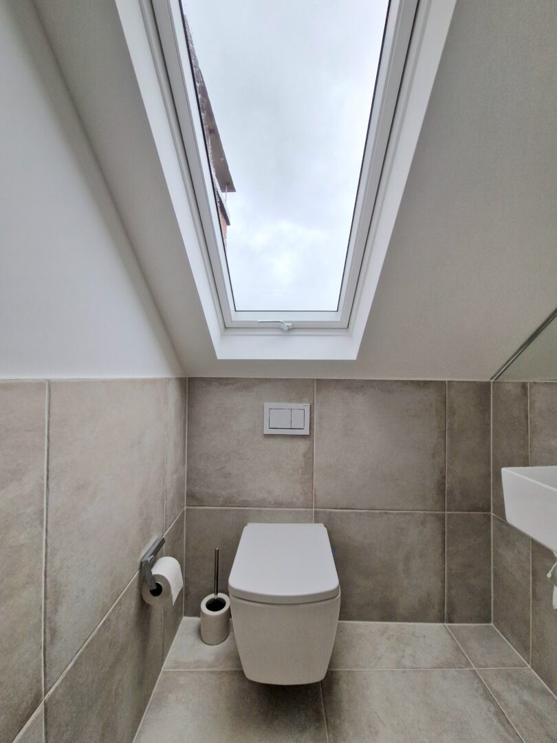 Das moderne Tageslichtbad besticht durch eine elegante Regendusche, einen stilvollen Waschtisch und hochwertige Armaturen. Ein separates WC sorgt zusätzlich für Komfort im Alltag.