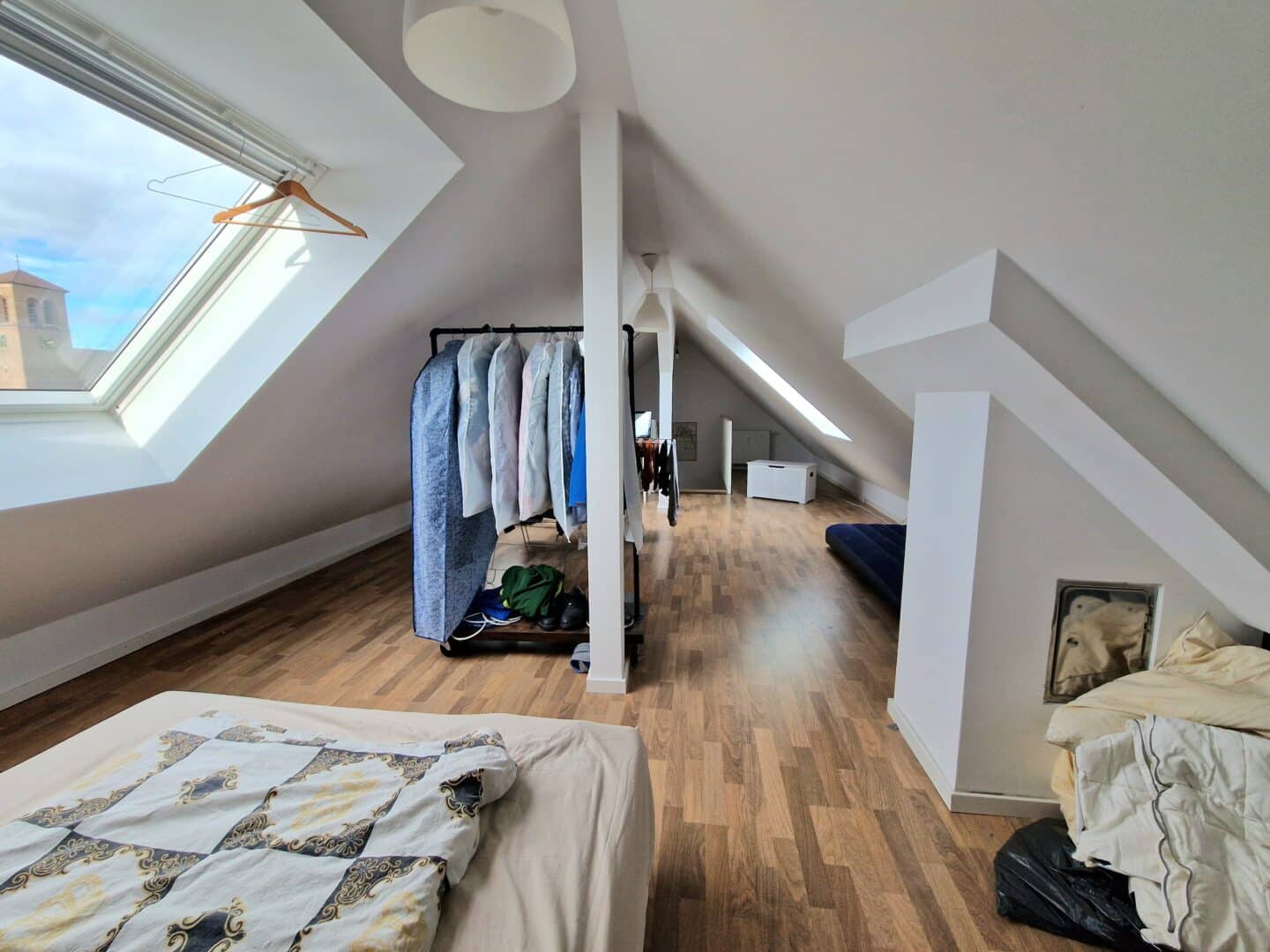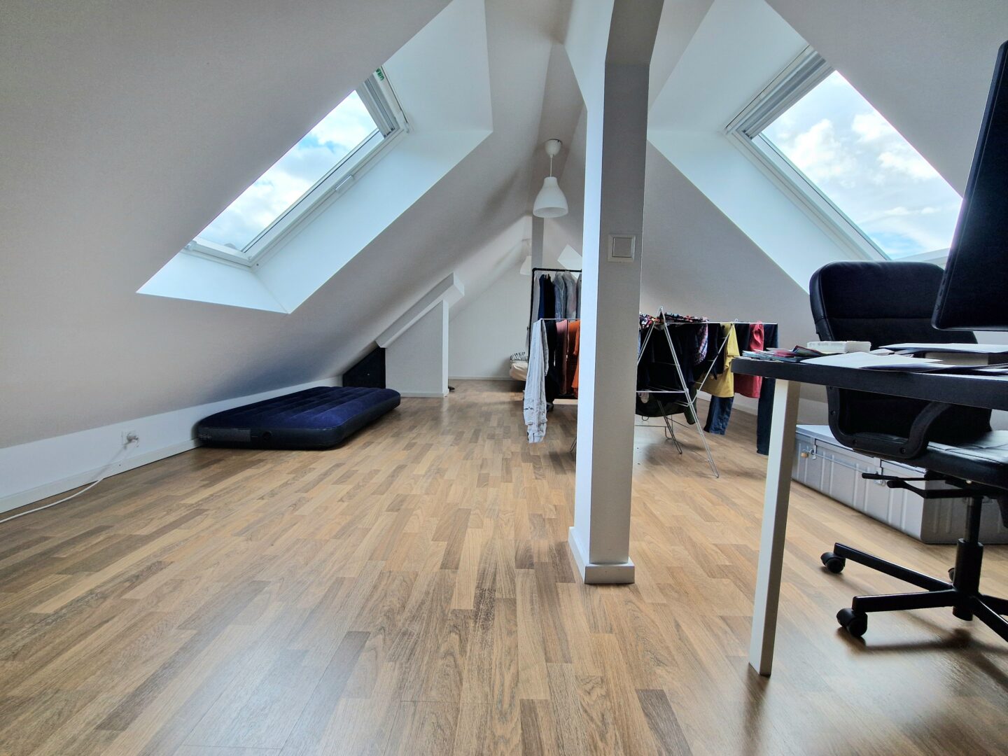 Über eine stilvolle Treppe erreichen Sie die zweite Ebene der Wohnung. Hier erwartet Sie ein großzügiger, offener Raum, der Ihnen vielfältige Gestaltungsmöglichkeiten bietet – ob als Homeoffice, Gästezimmer, Atelier oder Rückzugsort zum Entspannen.